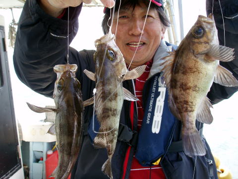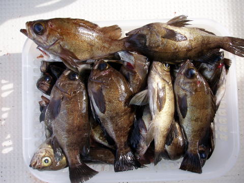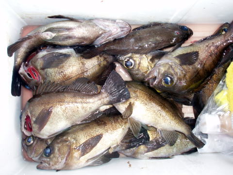 二日間吹いてた風も止み、今日は平日凪出船。 お客様は御二人様初乗船及びメバル釣り初挑戦 です。 今日は沖あがりまでボチボチ?と釣れた 感じかな?? 竿頭ジャスト30匹。二番竿28匹。 三番竿28匹。四番竿25匹。五番竿17匹。 5人で計28,5cm頭128匹でした。 新原様はメバル釣りは初めてとの事ですが良型を 筆頭に28匹の釣果はお見事です^^ 今回はメバルの他に良型アイナメ2匹と良型アラカブ も釣れました。 皆さん今日はお疲れ様でした。 |