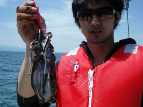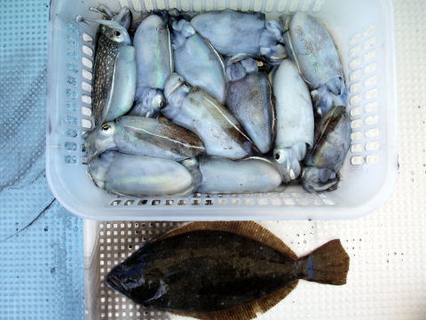 今日は初乗船のお客様は4名様です。 少人数で出船しましたがヒラメも少魚数?? 昨日に引き続き活性悪いです・・・ 歯型は付くのに針掛かりはしません。 今日はヒラメ、イカのリレーでしたが 釣れたのは皆さんイカだけです。 サイズは写真の通りヨカサイズです。 しかし墨が凄いです^^ 持ってる手も 墨だらけ〜 イカ釣りの時は良い服は 着れません。 イカ自体も自分で吐いた墨で 真っ黒け〜 ヒラメ、マゴチ狙いで早く行きたい のですが5月1日から出船です! 暫しお待ちを! 皆さん今日はお疲れ様でした。 |