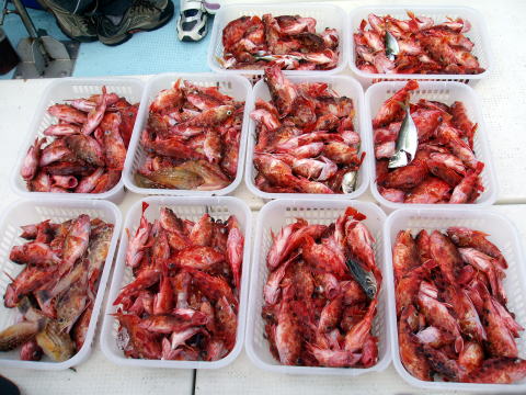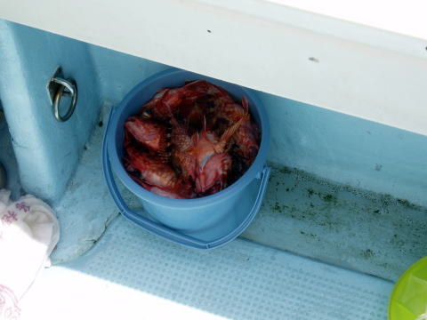 今日は遠征アラカブで出船しました。 初乗船及び初挑戦のお客様もおられます。 ポイント到着〜 ハイどうぞ〜 一投目から入れ食いです! 沖上がりまでず〜と入れ食いです^^ 竿頭で58匹。 二番竿で51匹でした。 港に帰ってから皆さん全員にアラカブの数を 数えてもらって 全体で27cm頭447匹でした。 皆さんアラカブ釣りが好きで昼飯も食べないで 黙々と釣っておられました・・・ 釣りと言うか、流れ作業みたい^^ これだけ釣れれば十分だと思います。 皆さん今日はお疲れ様でした。 アラカブ27cm頭に 447匹。 |