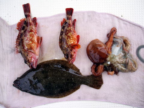 今日は連休以来、4日ぶりの出船です。 お客様は匿名希望のミスターK様1名乗船。 潮が流れてる時間帯だけ釣りたいと言う条件で ヒラメ、マゴチ狙いです。 今回は潮が思う様に動いてくれず釣果は伸びま せんでした。 正味3時間位です。 早上がりしましたが、釣果は左の通りです。 家族で食べる分しか釣れませんでした。 明後日位から潮周りが楽しい潮ですので面白いと 思います。 もちろん泳がせ釣りです。 お疲れ様でした。 ヒラメ、良型アラカブ、マダコ |