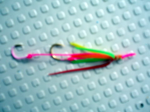 今日も格安真鯛で出船しました。 予報が雨予報だったので 今回は土曜日にしては少なめのお客様で出船です。 しかし、たいした雨降らなくて良かったです。 今日も大型真鯛見れません・・・ アタリも超〜渋いです・・・ しかし、お1人だけアタリ多すぎ・・・ 他の皆さんと違うのは仕掛けです。お客様持ち込みの 仕掛けで下の画像の仕掛けです。 キャビンの中からずっと見てましたが面白いように アタリがあります。 それも下げ潮の激流の中でです! 針掛かりさせるのは難しかったですが、改良の価値あり と言った感じですね^^ スカートの色を変えただけで アタリが変わりますので見てて面白いです。 アタリは多く小型が主体でしたが今後の課題ですね^^ お客様は色々と工夫されてますね〜 又それも楽しいと思います。 今日はサイズも数も不満が残る一日でしたが ネクタイの話で盛り上がりました^^ 針の部分は強度がなさそうなので交換した方が よさそうですね〜。 皆さんお疲れ様でした。 |
