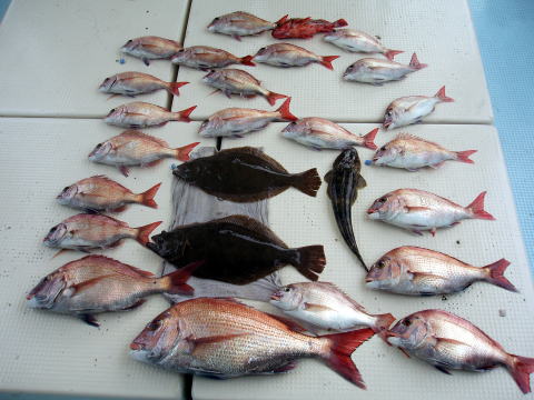 修理も無事完了して今日は格安真鯛で出船しました。 今日は土曜日にしては少なめのお客様で出船です。 各自両隣はお客様座ってないので、船内広々と使用 されてた感じです。 古賀様は今回も2kgオーバーの良型間代GET^^ 深浦様は今回強烈な引き込みがありましたが 残念ながら途中で6号のハリスぶち切っていきました・・・ 本人、凄く悔やまれておられました・・・ 残念・・・ しかし、お土産はしっかり釣られましたね{下の写真}。 ヒラメは今村様と古賀様は釣られました。 皆さん今晩は美味しい魚で一杯やって下さい^^ お疲れ様でした。 真鯛・・・2,2kg頭22匹。 その他・・・ヒラメ、マゴチ、アラカブなど。 |