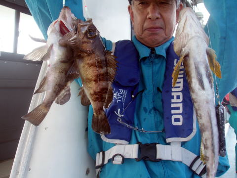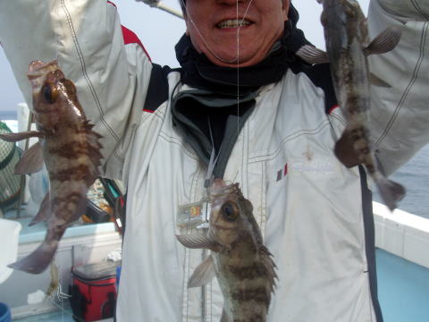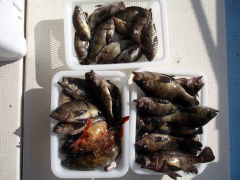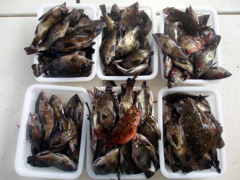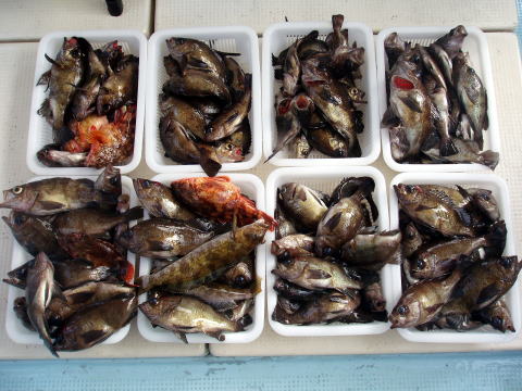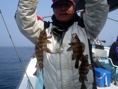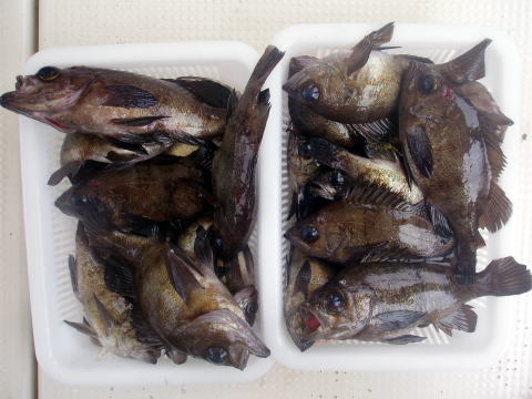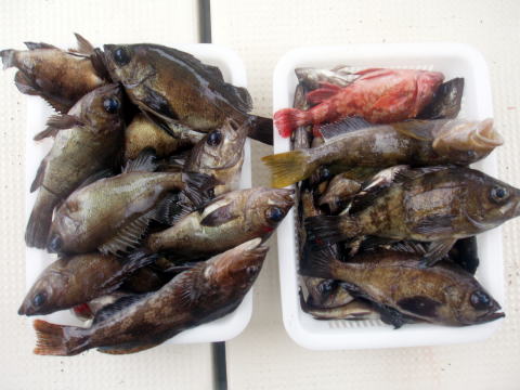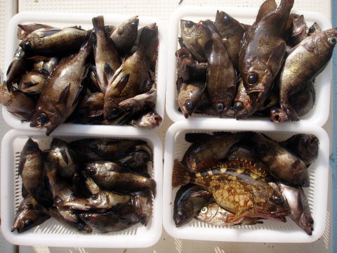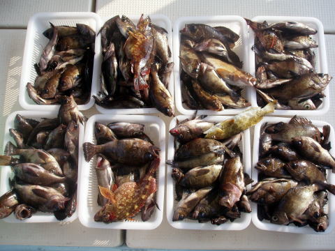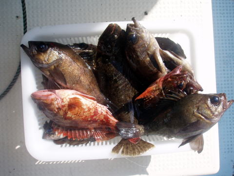 朝からヨカ天気〜 さあ〜出船です! 朝一はなかなか良い反応が見当たりません・・・ が・・・サイズは今日も良型多かったです。 特にアラカブとアイナメは超〜特大キングサイズです! メバルも尺はいませんでしたが28cmを頭に良型が 良く釣れました。 しかし人によってムラはあります。 常連様は皆さん釣果は安定してました。 今日数が伸びなかった方、次回リベンジお待ちして おります。 メバル釣りは覚えるより慣れる事です。 道具仕立てでも随分釣果が変わってきます。 皆さん今日はありがとうございました。 次回は25日{小潮}の金曜に出船します。 沖あがりまでずっと潮が流れますよ。 お時間ある方お待ちしております。 |