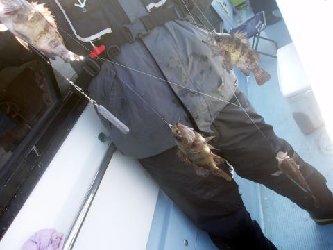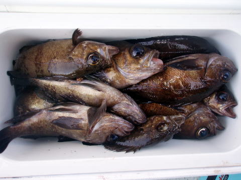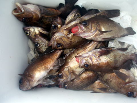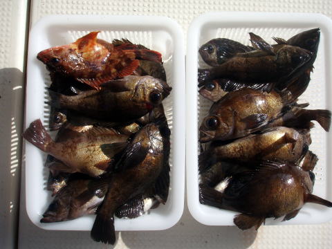 今日は日曜ですが、人数少なめゆったり出船です。 潮も長潮で天気予報が原因か??・・・ しかし、 天気は最高の天気でで日本晴れ! 風もなし、超〜ベタ凪で幻想的な雰囲気。 おまけにメバル入れ食いです! 朝一、一投目から右舷も左舷もトリプル〜又トリプル〜。 それも尺前後ばかりです^^ しかしポイントが少しずれたらまったく釣れません。 まさにピンポイント操船です。 神経使います・・・ 潮どまり前後に中だるみありましたが前半戦と 沖上がり前は良型ばかりの入れ食いでした。 28cm〜31cmの良型メバルが20匹以上いました。 お客様も、今日みたいな大型ばかりのメバルを釣った のは初めてとの事。おまけに2連〜3連ばかり^^ 竿頭でアラカブ含め40匹でした。 二番竿で35匹。 いや〜今日は忙しかったです。 リリースサイズは今日1匹もいません・・・珍しいです。 ビッグサイズのアラカブもアイナメも結構釣れましたが 写真はないです{クーラーの中}。 今日乗船の皆さんありがとうございました。 |