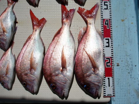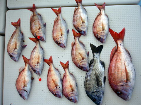 今日は二名{草野様、関岡様}のお客様でテンヤ真鯛 出船しました。釣果に差が出てしまいましたが食べる分 はしっかりありますね^^ 下げの五分で一番食いが良かったですね〜 しかし今日もスッポ抜けが多かったです。 途中まではあがってくるのですが・・・ 合わせるタイミングをずらすのも手ですよ。 草野様、関岡様今日はお疲れ様でした。 明日は初乗船の3名グループのご予約でしたが 19時前にキャンセルが入りました。 よって明日はお客様おられません。 明日はお休みです。 |