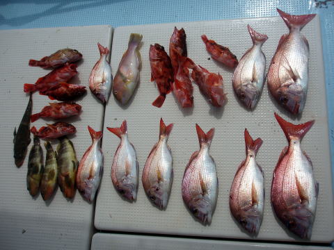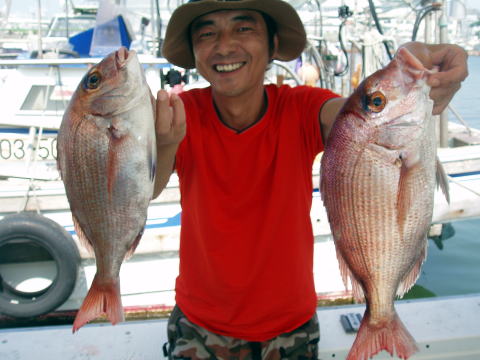 今日は徳永様とお友達の方と近場の五目釣りで出船しました。 普段は仕事が忙しくて釣りはほとんどしないとの事、 でも一年に一度だけ尚人丸に遊びに来られます^^ 一年ぶりでご無沙汰です。 大物はいませんが、ぼちぼち楽しめた感じです。 来年も又遊びに来て下さいね^^ お待ちしております。 暑い中お疲れ様でした。 明日の近場テンヤ真鯛頑張ります! 現在2名です。 |