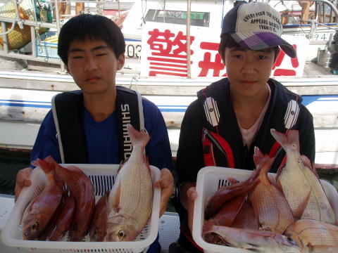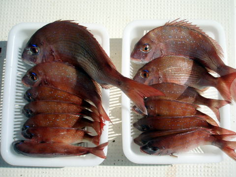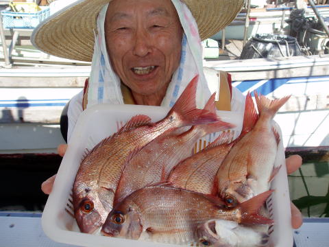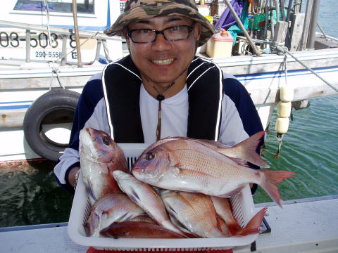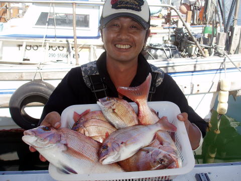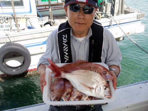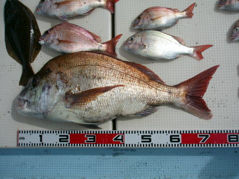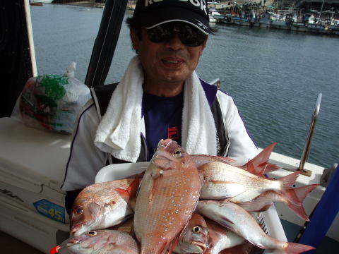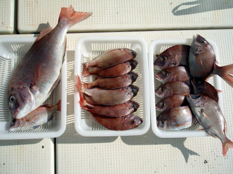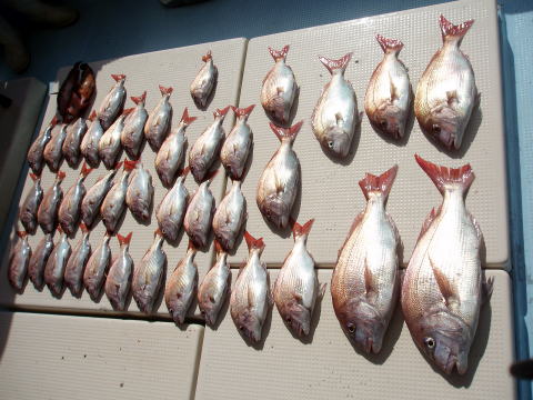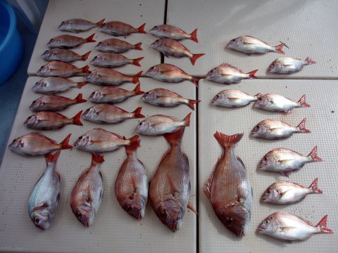 今日は平日出船です。 4人のお客様と近場真鯛で出船しました。 今日も大鯛目指して頑張りましたが真鯛2,2kgどまり・・・ でも刺身にして美味しいサイズ^^ 昨日の様な入れ食いタイムはなかったが、 これだけ釣れれば悪くはないと思います。 しかし昨日釣れたポイントは今日は活性薄・・・ 今日釣れたポイントは別ポイントです。 ほんと魚釣りはわからないもんです・・・?? 今回も又涼しかったです。秋の気配が徐々に 感じられる様になりましたね〜 皆さんお疲れ様でした。 又、遊びに来て下さいネ。 ・・・・・・・・・・・・・・・・・・・・・・・・・・・・・・・・・・・・・・・・・・・・・・・・ 真鯛・・・2,2kg、1,7kg、1,3kg 3匹。 真鯛・・・800g 2匹。 真鯛・・・700g以下34匹。 真鯛合計・・・39匹。 その他外道・・・アコウ3匹、キス、グチ{多数} |