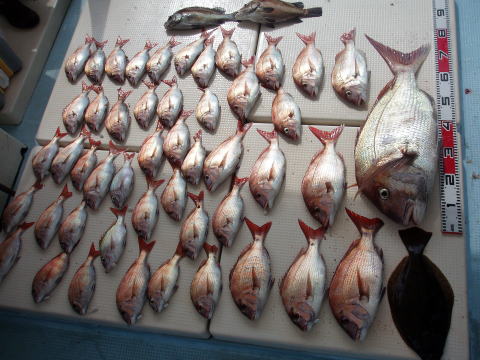 今日は日曜ですが少人数{3名}で出船しました。 お客様は深浦様、ミスターI様、初乗船の吉富様です。 今日はよう〜釣れました^^ 皆さん忙しかったみたいです。 嬉しい外道でヒラメも2枚釣れました。 真鯛は大型はいませんが1,2kg頭で45匹。 十分な数だと思います。 昨日と違ったのは今日の棚・・・ シャクッテその棚まで持っていけばガツンと食ってきます。 船長の指示でその棚に合わせてもらいました。 皆さんニコニコしながら今日は釣りされてましたね^^ 良かった 良かった。 今日も最高の秋晴れ、気持ちが良かったです。 皆さん今日はお疲れ様でした。 あと3日間、28日の水曜までは晴れ予報みたいです。 次回は平日27日{火曜}、28日{水曜}に近場の 真鯛で出船します。 真鯛・・・1,2kg頭45匹。 その他・・・ヒラメ、アラカブなど。 |