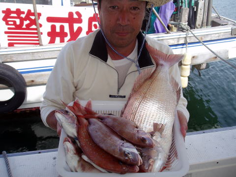 メンテ作業などがあり、久々の出船です。 土曜ですが5名のお客様で近場真鯛です。 今日も出ました! 大鯛81cm 6,5kg! 釣られたのは常連の深浦様です。 二週間前に85cm、7,6kgの大鯛釣られたばかり なのに今回も大鯛GETです。 相変わらず良い腕 しておられます。 数もトップです。 写真の1,5kgの真鯛が小さく見えます・・・ 今日も一投目から順調に皆さんに真鯛が釣れて アタリも凄く多かったです。 しかし、相変わらず 釣れるポイントと釣れないポイントの差は激しいです。 上げ潮、下げ潮、瀬の形、潮の速さ、潮目など条件が 揃えば又、大鯛狙います! 入れ食いとまではいきませんがボチボチと釣れた感じかな? 今日乗船の皆さん、ありがとうございました。 明日も頑張ります! 真鯛・・・81cm、6,5kg頭に50匹。{2匹クーラーの中} その他・・・外道いろいろ。{各自クーラーの中} |