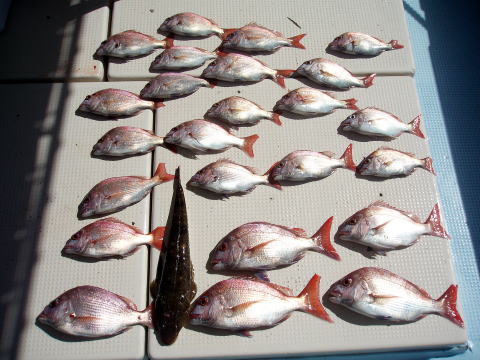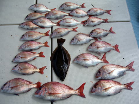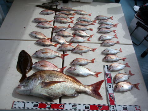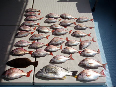 昨日に引き続き、今日も平日出船です。 お客様は一木様、末次様、日高様、松下様です。 下げ潮が流れ出した途端にアタリが連続! が、しかし今日もスッポ抜けが非常に多かったです・・・ 合わせのタイミングを変えた方だけに釣果が繋がりました。 でも今回も大鯛は見れなく残念でした。 キロオーバーは真鯛ではなくキビレだけです。 まあ〜ぼちぼちと楽しめた感じです^^ 皆さんお疲れ様でした。 真鯛・・・31匹 その他・・・ヒラメ、アコウなど |