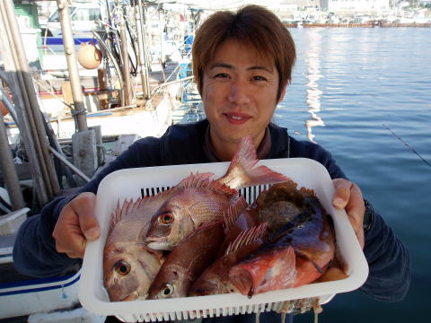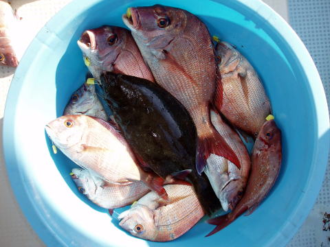 今日は平日出船です。 お客様は坂井様、一木様、深浦様、上野様、森田様です。 結果は大漁!でした^^ 前半戦は良いポイントに当たらず、凄く苦労しましたが 後半戦は爆釣でした。 大鯛はいませんが写真の様に 中鯛がかなり混じりました。 女性釣り師の坂井様も大活躍でした。頑張りましたね^^ 凄く楽しかったと喜んでおられました。 皆でこれだけ釣れれば今日は疲れたと思います・・・ 皆さん今日はお疲れ様でした。 週末の度に天気は雨・・・今度の週末は久々に 小春日和の予報ですね〜 潮周りも上げ潮及び 下げ潮と両方狙えます! ご予約お早めにお待ち しております。真鯛は今期最後の土曜、日曜出船になります。 真鯛・・・キロオーバー頭に55匹。 その他・・・ヒラメ、アラカブ、セトダイなど。 |
