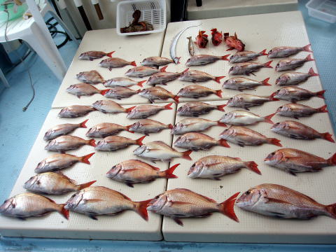 今日も平日出船です。 お客様5名で出船でした。 今日で今期の真鯛釣り最終日です。 が・・・あまりにも釣れ過ぎるので船長微妙・・・ そして、高崎様に大鯛ヒットしたのですが竿が海面に 突っ込んでラインブレイク・・・あれは惜しかったです・・・ 一旦今回で真鯛は終了しますがお客様の要望で 26日の土曜日に一日だけ限定で真鯛釣り出船します。 もちろん、ご予約のお客様は今日乗船のお客様^^ ありがとうございます。 今日乗船の皆さんお疲れ様でした。 真鯛・・・1,7kg頭に43匹。 |
