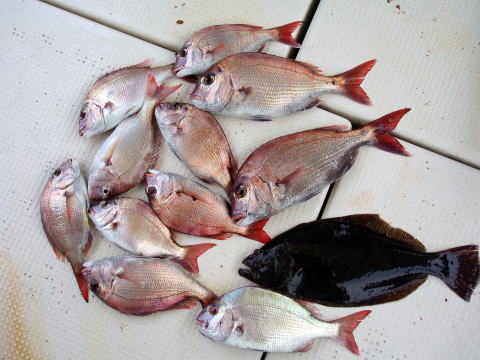 今日も凪の中出船です。 前半戦はボチボチ活性が良くて中盤は激渋状態・・・ しばらく沈黙状態が続きましたが後半の下げ潮では 一気に47匹まで伸びました! 皆さんのお土産が十分に出来て良かったです。 真鯛釣りもあと少しか〜・・・ メバルも早く釣りたいが 真鯛もまだ活性良いし・・・ 微妙・・・ でも区切りをつけて16日{水曜}中潮で名残惜しいが 終了します。 お時間ある方お待ちしております。 今日乗船の皆さんお疲れ様でした。 明日も真鯛釣り、頑張ります! 真鯛・・・47匹。 その他・・・ヒラメ、カワハギ、アラカブ、セトダイなど。 |