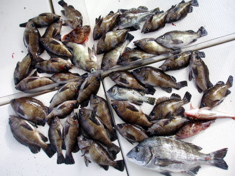 真鯛釣りは一旦16日で終了したのですがお客様の ご要望で今日一日限定で真鯛釣り出船しました。 今日は潮早いです! そして、これだけ釣れました! ほんとに今日で最後にするつもりですが、こんなに 釣れると心残りです・・・ でも本当に今回で終了です。 内容的に釣れるポイントと釣れないポイントの差は 凄いです。 釣れない時はエサも付いたまま・・・ アタリもカスもない状態・・・ しかし釣れるポイントは一斉に5人同時ヒットと 入れ食い状態でした。 真鯛の群れが小さくて ベイトの反応見ながら、メバル釣りの様な事したら 仕掛けを落とした瞬間{フォール中}にガツンと 食ってきます。 棚も今日は微妙な棚で、その棚に 合わせた方は数釣ってましたね〜 真鯛終了日に良型真鯛見れて船長嬉しかったです^^ 最後に気持ちが良い終わり方で満足な一日でした。 皆さんも楽しめたご様子で良かったです。 今日乗船のお客様ありがとうございました。 来年の春から又ノッコミ真鯛で出船します。 明日から又、メバル{五目?}釣りで出船しますので 宜しくお願い致します。 真鯛・・・3,4kg頭56匹。 その他・・・尺アラカブ頭4匹。{外道少なくほとんど真鯛でした} |