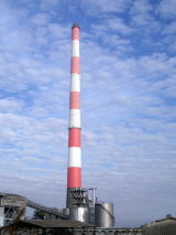 赤白の煙突で白い点滅ライトが光ってます。
