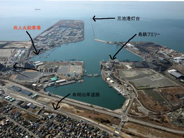 到着します。 左側方面が三池港です。