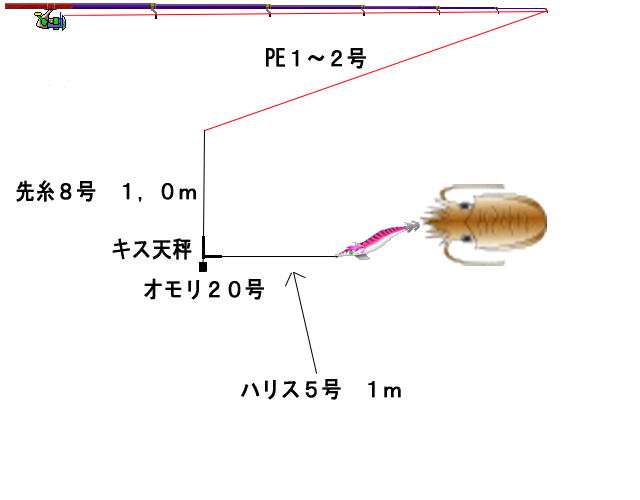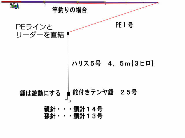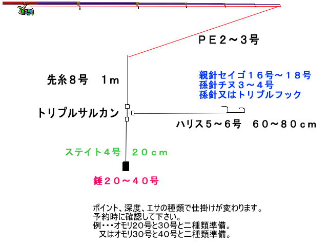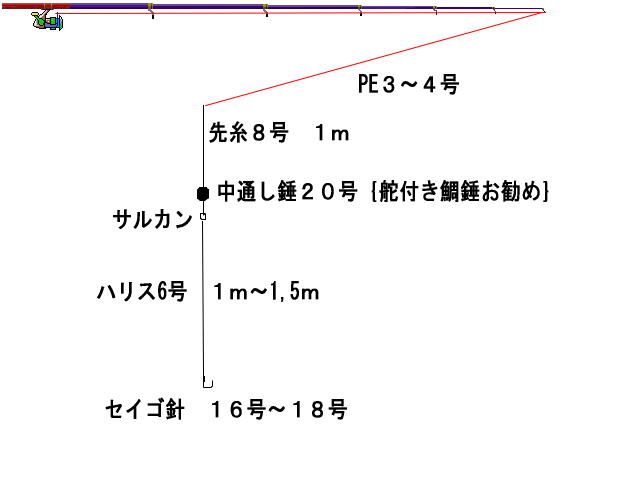 | 仕掛け | PE4号→先糸8号{1m}→穴あきオモリ20号{舵付きテンヤオモリお勧め} →サルカン→6号ハリス{1,5m} 針、セイゴ針16号〜18号 ・オモリは先糸8号の中で遊動にする。 |