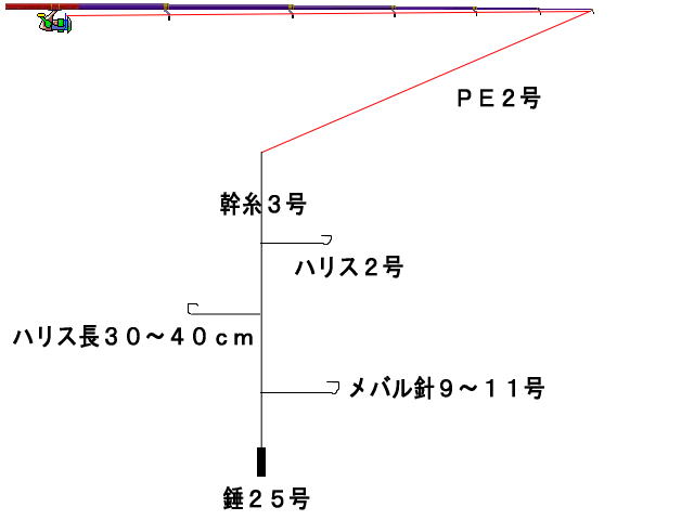 | 仕掛け | 竿釣り・・・上の図。 手釣り・・・道糸トトマスター10号→中錘→ハリス5〜6号、9m あとは竿釣りと同じ。 |
