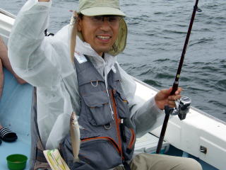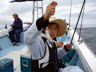 息子さんです! まだ小学5年生なのに お父さんより釣ってましたね〜 尚人丸はマダイ釣り以来かな? マダイのテンヤ釣りの時もお父さんより 釣ってたね〜 凄く釣りのセンスがよくて 私の弟子にしたいくらい・・・ シケの中にもかかわらず頑張ってくれました! |