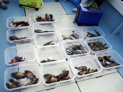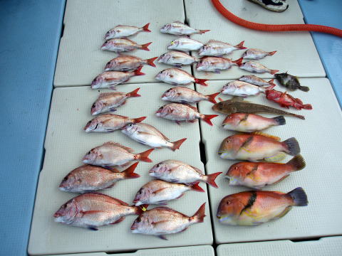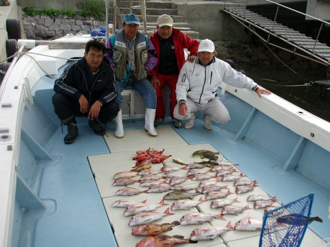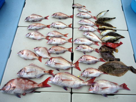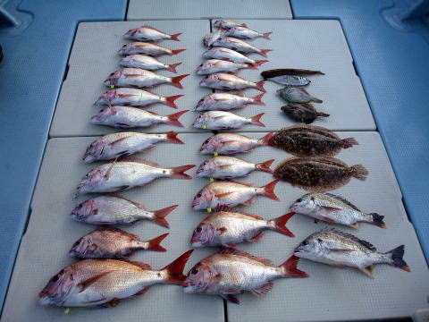今日は小型のマダイばかり・・・ 残念ながらボウズのお客様も 2人おられました。 1人のお客様に強烈なアタリが ありましたが残念ながら バレてしまいました。 大マダイの顔見たかったです・・・ マダイ・・・800g頭に 25匹 イラ・・・1,1kg頭に 4匹 その他・・・マゴチ、アラカブ、カワハギ |
