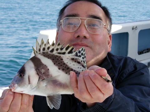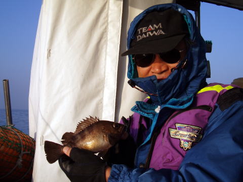 今日の大物賞です! アコウ・・・1,2kg マダイ釣りの絶妙なタナ取り さすがです! ついでにアコウまでGET! 2匹も・・・ |