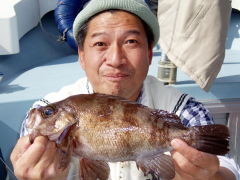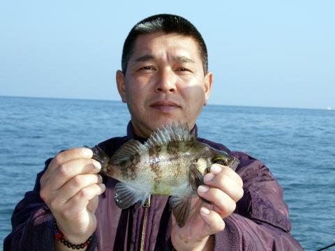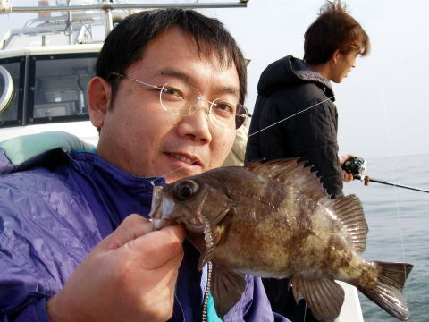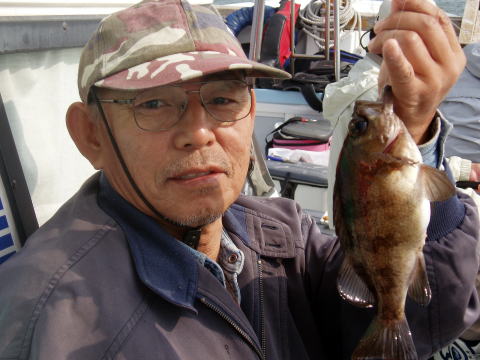 前半戦はカワハギにエサを 取られてばかりで苦労されて ましたね〜 カワハギ釣りは ちょっとコツがいります・・・ 船中1発目のメバルです!! |