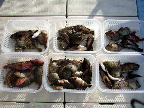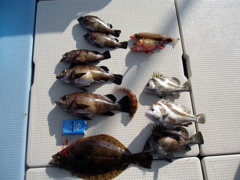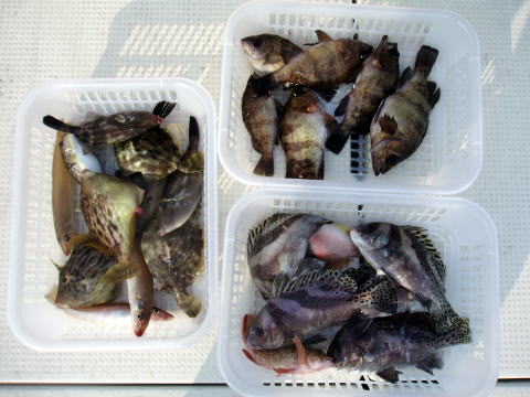 今日のお客様{3人}は五目釣り ご希望との事で出船しました。 朝から風でウネリがあり アタリも取りづらく 釣果は ごらんのとおり・・・ 水温も、まだ20度きってない・・ ヒラメ・・・900g 1匹 メバル・・・32cm頭に 5匹 コショウダイ・・・3匹 その他・・アラカブ、キス |