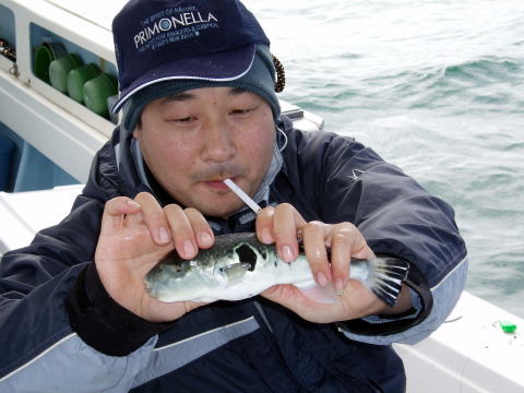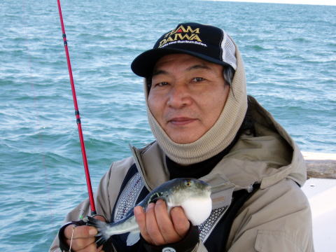 11月は型はいいのだが 数にムラがある!! 今日はこれだけです・・・ {船中} トラフグ・・・23〜28cm 25匹 ショウサイフグ・・・2匹 かかり釣りで暇なので船長も 釣りのお手伝いしました。 |