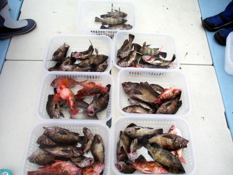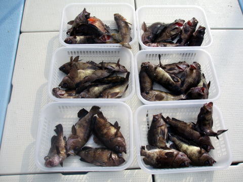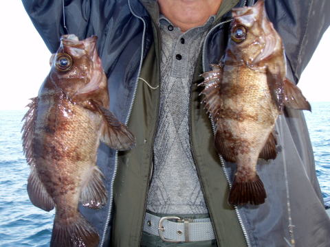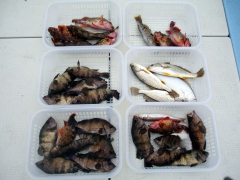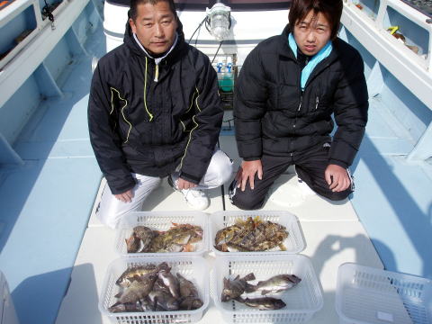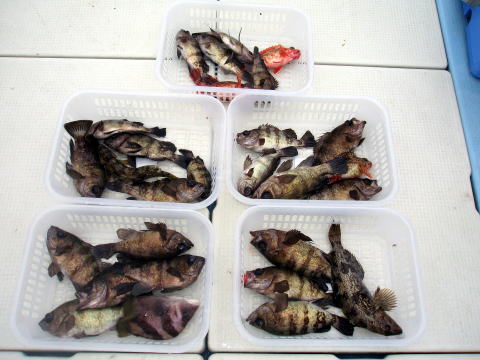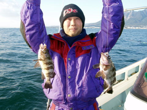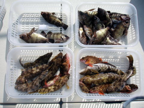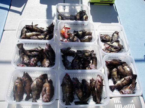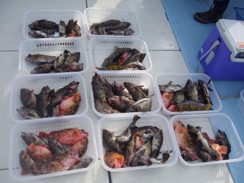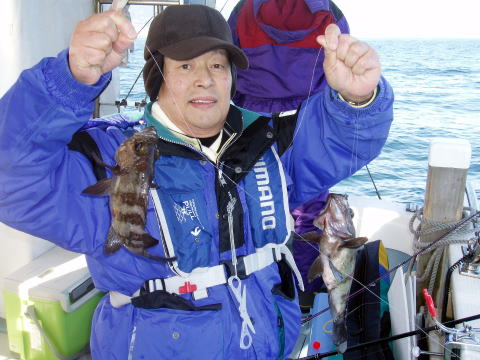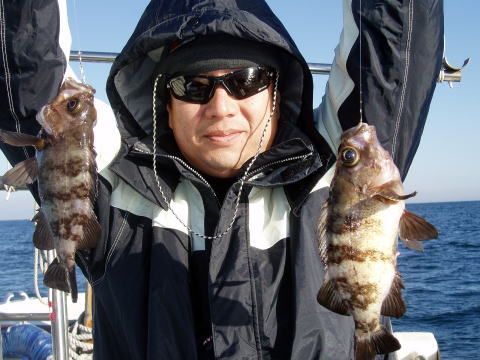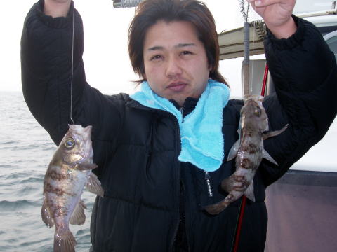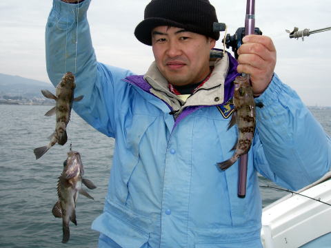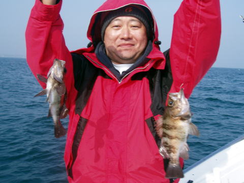 今日は有村様親子と福島様の乗船でした。 状況として、今日は潮がまったく動きません・・ おまけに10時頃から北東の風8m〜10m!! メバルの食いも、さっぱりでした。しかし アイナメの型が良いのが混じりました。 今日は早上がりしました。 メバル・・・15匹 アラカブ・・・6匹 アイナメ・・・8匹{30cm〜40cm} |