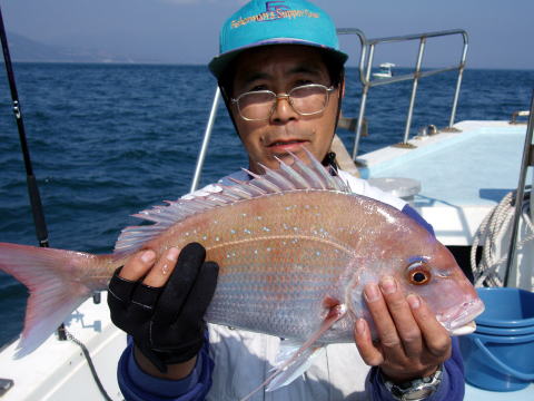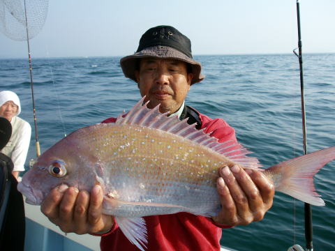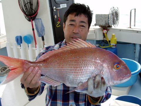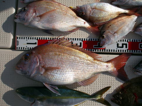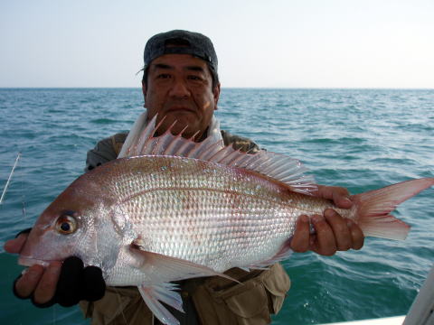 今日は大半の人がテンヤ釣り初挑戦でした。 が、しかし最後までタナ取りに苦労されて満足 いく釣果が出ませんでした。 釣果も昨日の 半分以下です・・・ マダイの3kgオーバーを 期待しましたが今日も残念でした。 又のご来場お待ちしております。 マダイ・・・2,3kg{56cm} 1匹。 2,1kg{54cm} 1匹。 1,7kg{49cm} 1匹。 1,4kg{46cm} 1匹。 その他のマダイ20匹。 合計 24匹。 チヌ・・・38cm頭に5匹。 ヒラメ{ガンゾウ} 2匹。 その他・・・カワハギ、アラカブ、イラなど。 |