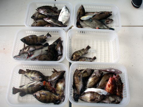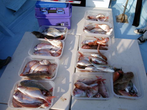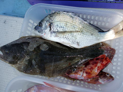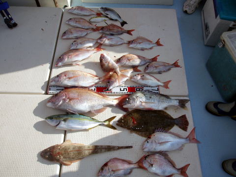 今日は、よう釣れました^0^ マダイの他にも色んな魚が釣りたいとの要望で マダイメインの五目釣りとなりました!! 潮が動く間は、ずっと釣れ続き皆さんは大変 ご満足で一日中〜笑顔の連続でした。 しかし、これだけ釣ってもかなりの数のバラシが あり、30匹位のバラシ多数でした。 非常に残念だったのは国崎様の痛恨のバラシ! ハリスをブチ切っていきました・・・あれあげてほしかった ですね〜 凄い引きでハリスがもつか心配で見守って いましたが、やはりハリス切れで本人ガッカリ・・・ 魚釣りってこんなもんです・・・又、仇討ちに来て下さい。 久々の大漁で皆さんお疲れ気味で帰りはキャビンで 爆睡状態でした^0^ 今日はお疲れ様でした〜〜 マダイ・・・1,3kg頭に55匹。 ヒラメ・・・45cm頭に9匹。 マゴチ・・・42cm 1匹。 チヌ・・・43cm頭に3匹。 アラカブ・・・7匹。 ネリゴ・・・1匹。 イラ・・・5匹。 |