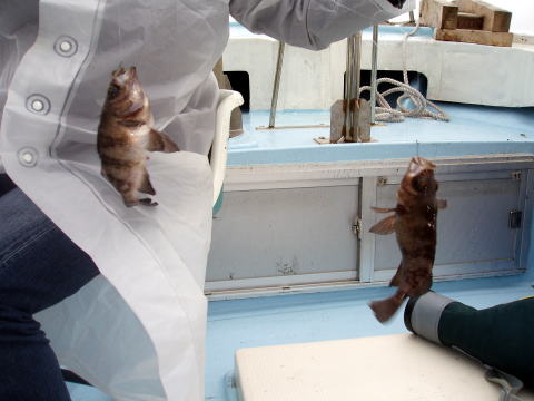 | 2006年 11月18日 | 今日は何でかわからないけどアタリが非常に 少なかったです・・・ 朝の一発目から船の周り にイルカの群れが・・・不吉な予感が?? 最後まで厳しい釣りとなりました。 半分以上は初心者のお客様で最後までタナ取りに 苦労されて釣果は伸びませんでした。雨の中皆さん お疲れ様でした。一日中雨だったので釣果の写真 撮るの忘れました。スイマセン。 マダイ・・・1kg頭に7匹。 コショウダイ800g 1匹。 その他・・・カワハギ、フグなど。 |