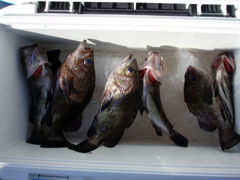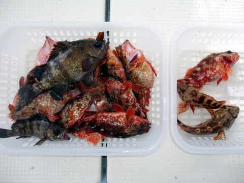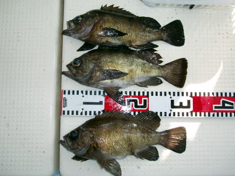 今日は、なぜか満ち潮だけしか食いません・・・ 下げ潮はパッタリです。 スズキも釣れません。 釣れる時は楽しいのですが、釣れない時は胃が 痛いです・・・ 自然相手の仕事は気を使います。 明日も頑張ります! メバル・・・27cm頭に32匹。{写真のみ} 数名のお客様はクーラーに入れられた ので数は確認してません。 アラカブ・・・1匹。 コショウダイ・・・1匹。 |