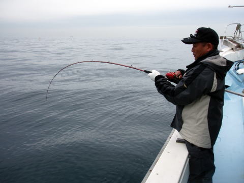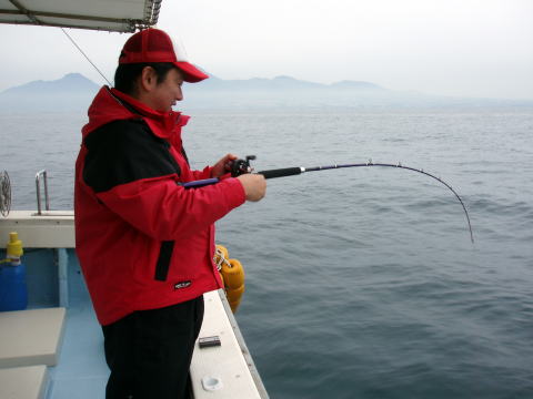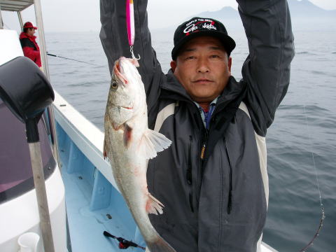 今日は第一回お客様を連れての開拓調査出船です。 最初のポイントでは潮具合がパッとせずおまけに群れも 小さく、それから群れを探して移動〜〜 数箇所まわった 所で良いスズキの群れ^0^ ここぞとばかりにお客様に気合 を入れた!{今チャンスですよ〜} 今日乗船された4人は 皆さんジギング初挑戦! 最初は戸惑い気味でしたが釣り方の 要領を伝えると、すぐにコツをつかんでHIT!こっちもHIT! 最初はバラシばかりでしたが慣れたらニコニコ顔^0^ お客様いわく{船長〜まさかこげんか物でスズキとか釣れるとか 思わんやったばい。おらクーラーも持ってきとらんばい}との お言葉・・・{^^} 皆さん病み付きになられたそうです^0^ 船長も以前からジギングを考えてたんですが今回はジギングを 企画して開拓調査出船しました。今日は朝ものんび〜り出船して 昼も早あがりで釣る時間は、ちょっとしかなかったですけど皆さん 満足して頂いたので船長も安心しました。船長もジギングを やりたかったですが、なんせ群れの中にジグを入れるピンポイント 操船で釣る余裕なかったです・・・ マダイのラバージギングも 現在企画中ですので、その時は又・・・{^^} スズキ・・・60cm〜68cm ジャスト 20匹。 その他・・・コショウダイ、イカなど。 |