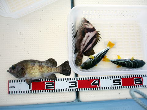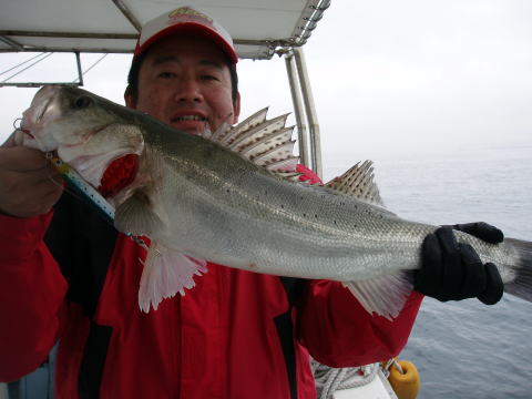 今日は少人数{2人}山本様、渡辺様の乗船 でした。 前半戦はメバル釣りでしたが今日は あまりにも潮が早すぎてメバルの活性最悪・・・ 根にもぐったまま出てきません。 しばらく辛抱 して釣りましたが結果はご覧の通り・・・ 後半はスズキのジギングでした。 昨日の スズキは群れも大きく活性大でしたが、今日は 大きな群れを発見出来ず単発のスズキがポツリ ポツリ・・・ 昨日に引き続きバラシの連発!! 昨日は福島様のリールが巻けない位の大スズキ のバラシ!今日も山本様の大スズキのバラシ! 船長タモ持って構えてたのですが残念です。 今日のお二人もジギング初挑戦でしたが、{船長 〜、この釣り楽しいね〜}と言ってて喜んでおられ ました^0^ 数がもっとあがってたら良かったので すが日によって釣果はまちまちです。今日は スイマセンでした。 メバル・・・5匹。 スズキ・・・64cm頭に 4匹。 その他・・・コショウダイ、アイナメなど。 |