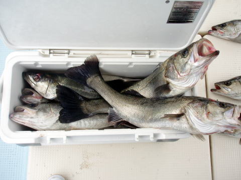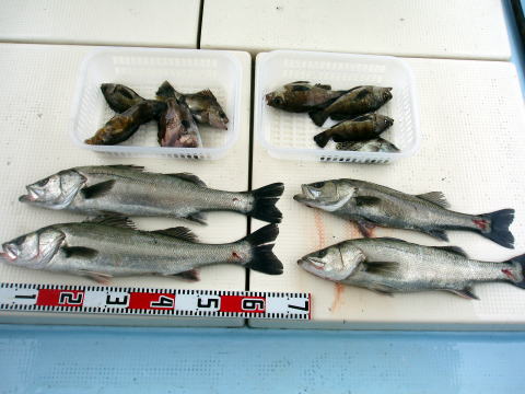 昨日に引き続き今日も潮メチャクチャ早過ぎました。 明日はまだ早い潮です! 今の大潮は普通の大潮 と違って一年の内で一番干満の差がある潮です! なんと満潮と干潮の差が5m以上もある潮ですよ。 メバルもビビッて出てきません・・・メバル今日も撃沈 でした。まともに釣った時間は1時間ほど・・・ スズキは群れは小さかったがジャスト80cmのスズキ を頭にご覧の通り。 今日は唯一ジギングの経験が ある山下様に頑張ってほしかったのですが、釣られた のはジギング初経験のお客様ばかり。山下さんリベンジ お待ちしておりますよ^0^ 今日は皆さんお疲れ様でした。 メバルは今度の小潮までお預けです。 メバル・・・5匹。{クーラーの中} スズキ・・・80cm頭に 10匹。 その他・・・アラカブ、コショウダイ、アイナメ、マダコ フグなど。 |