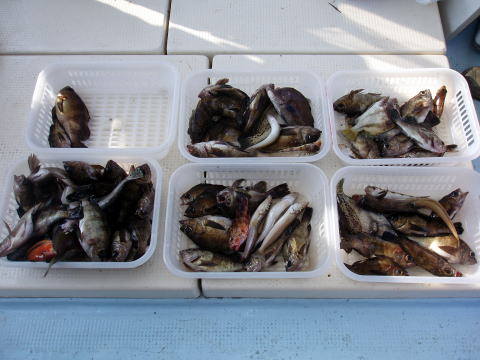 今日は出船時間になっても、まだ風が残ってたので1時間 ほど時間をずらしての出船となりました。 今日はメバルの アタリが少なかったです。 ポイントによってはフグとトラフグ のエサ取りに悩まされました。 型も27cmどまり・・・ 水温も朝と昼との差が凄かったです。 次回の出船の3連休 {22日{中潮}、23日{大潮}、24日{大潮}は違うポイント を攻めてみます! 今日乗船の皆さんお疲れ様でした。 メバル・・・27cm頭に 23匹。{各自クーラーの中} アイナメ・・・40cm頭 4匹。 アラカブ・・・4匹。 真鯛・・・36cm 1匹。 チヌ・・・2匹。 ウマズラ・・・1匹。 フグ、トラフグ、ベラ多数。 |