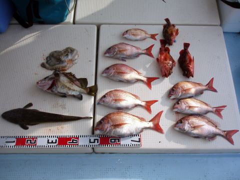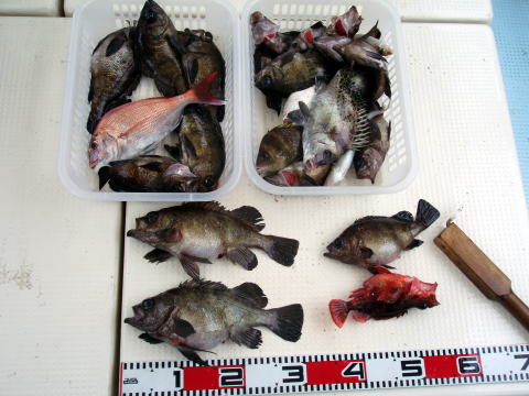 今日は大潮! 新しく開拓した大潮のポイントを攻めて みました。 魚探で見ても見逃すような小さな瀬でピン ポイント操船。気を使います・・・ 今日も水温は ちょっと高め・・・ 安定した水温になれば、もっと釣果 は期待出来ると思います。 結果の方も釣られた方と 釣られない方に差が出てしまいました。 タナ取りを まめにされた方に軍配があがった一日となりました。 皆さん今晩のオカズにメバルの刺身、煮付けと豪華に なりそうですね^0^ 今日も皆さんお疲れ様でした。又のお越しをお待ちしております。 メバル・・・28cm頭に 53匹。 アラカブ・・・5匹。 鯛・・・2匹。 キス・・・2匹。 ウマズラ・・・2匹。{特大} イラ・・・2匹。 その他・・・フグ、トラギスなど。 |