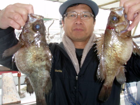 今日はメバル釣りで出船しました。 朝から暖かいのは良か ったのですが前回に比べるとアタリが少なかったみたいで す。人によって釣果に差が出て二桁のお客様はお二人だけでした。まだ水温が不安定で上がったり、急激に下がった り・・・安定すれば皆さんに喜んでもらえる釣りが出来ると 思います。メバルの型も27cmとまりでした。 今日も尺メバルは見れませんでした・・・ 昨日までの時化もおさまって今日は気持ちが 良い天気で良かったですね。 皆さん一日お疲れ様でした。 メバル・・・27cm頭に 52匹。{各自クーラーの中} アラカブ・・・8匹。 イラ・・・4匹。 コウイカ・・・1杯。 トラギス・・・多数。 |