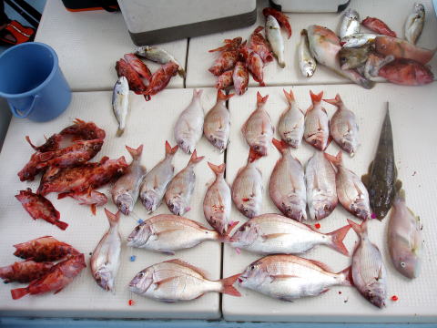 今年初の遠征真鯛出船です。 昼は暑いので朝は早めに出船しました。 朝方は右舷も 左舷も真鯛があがりはじめました。 後に2枚潮になり 皆さん棚を取るのに一苦労・・・ ここで釣果に差が出て しまいます・・・ PEラインの号数が大きい人は大変・・・ タックルはシンプルイズベストですよ! 残念ながら本命の真鯛が釣れなかったお客様も数名 おられました。 しかし他の魚達は沢山釣れました。 大きなコロダイ。でかいイラ。良型アラカブ、アコウなど。 魚は面々クーラーの中に入れられていたので今日は 全体写真はありません。 次回の遠征真鯛は19日の 土曜日に出船します。 次回は潮が動くので大真鯛に 期待したいですね〜 今日は皆さんお疲れ様でした。 {おまけ} 19日は船長の誕生日です。誰も祝ってくれません・・・ 一番のお祝いは爆釣です。時間がある方乗船お待ちしております。 |