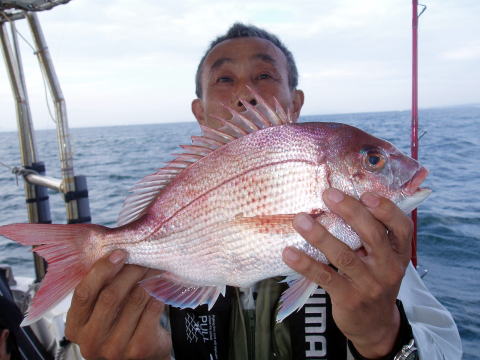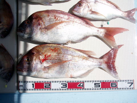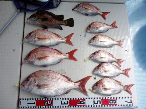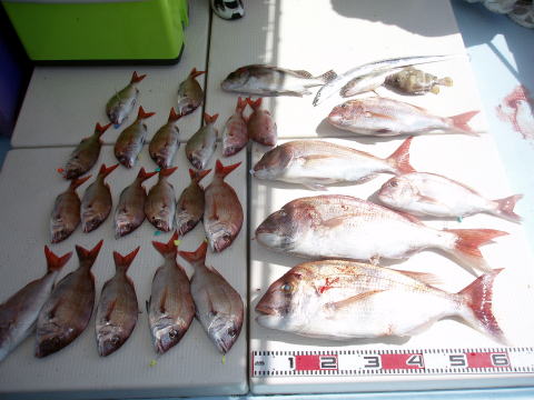 今日も真鯛釣り出船です。 でしたが朝から思った以上に風が強くて 残念ですが遠征を中止して浅場の波が立たないポイント での釣りとなりました。 朝方1時間はアタリも多かったの ですが潮どまりでアタリはとまりました。 下げ潮になって さて真鯛再開〜 しかし今日の下げ潮は干満の差が非常 に早く、皆さん棚取りに非常に苦労されてみたいで根掛か りとオマツリが非常に多かったです。 時合いがもうちょっと 続いていたら数も伸びてたと思います。 昨日に引き続き今日も数は伸びませんでした。 潮が緩い時なら初心者の方も棚取りが楽になると思います ので楽しい釣りが出来ると思います。今日は皆さん乗船 ありがとうございました。 お疲れ様でした。 真鯛・・・45cm{1,6kg}頭に10匹 {1匹クーラーの中} その他・・・コショウダイ、 シログチ、フグなど。 |