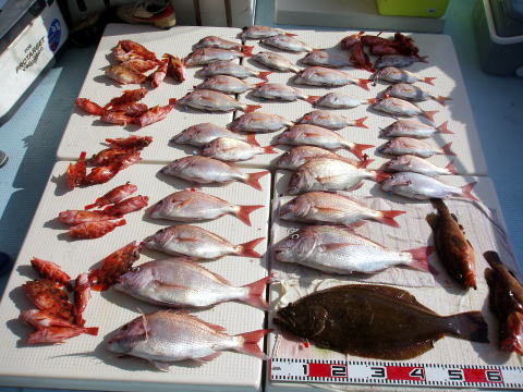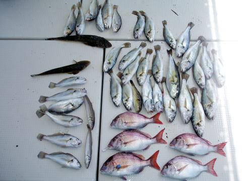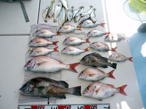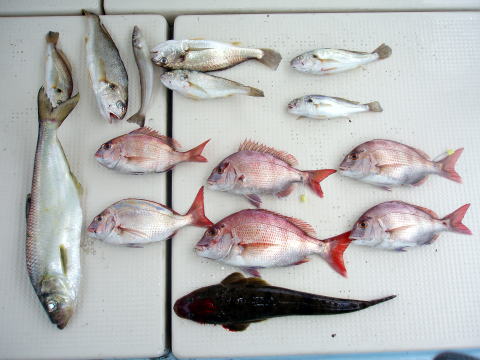 今日はお客様が4名おられれば遠征真鯛の予定でしたが 残念ながら人数が満たなかった為に遠征は中止となりま した。 代わりにお手軽コースの格安真鯛で出船しました。 那須様親子は今回は始めての乗船で、息子さんは大活躍 でした。釣りのセンスありますよ^^ なんと小学1年生とか。 先が楽しみですね〜 お父さん今日は子供さんのお世話で 1日お疲れ様でした。 子供さんにとって今回は良い記念に なったと思います。 今日の竿頭は常連様の大塚様でした。 毎度毎度、安定した釣果です。安心して見ていられますね^^ 釣果に差が出てしまいましたが、やはり棚取りに慣れた方は 楽しみながら釣りをされてますね。 皆さんお疲れ様でした。 真鯛・・・51cm{1,8kg}頭に15匹。{1匹クーラーの中} コショウダイ・・・49cm{1,9kg}頭に2匹。 その他・・・キス、シログチ、ショウサイフグ、ヒラなど。 |