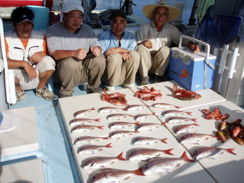 今日の予報は雨! しかし朝から青空も見えてヨカ天気 です。 のちに雨が降ったり止んだりの天気でした。 今日は皆さんウネリの中での釣りとなって、さぞ釣りにく かったみたいです・・・ ウネリの為に棚が非常に取りに くくて、アタリがあって合わせてても針のすっぽ抜けが 目立ちました。 今回はヒラメもアコウも見る事ができ ませんでした。 雨の中皆さん頑張ってくださって ありがとうございました。 お疲れ様でした。 真鯛・・・1,1kg頭に27匹。 その他・・・アラカブ{各自のクーラーの中} |
