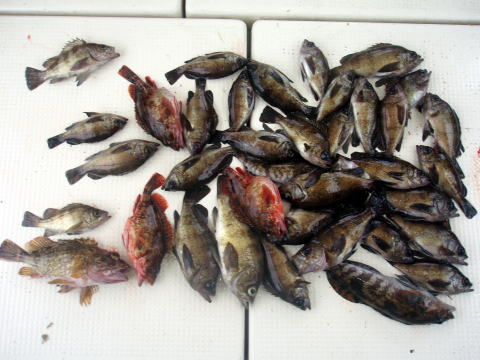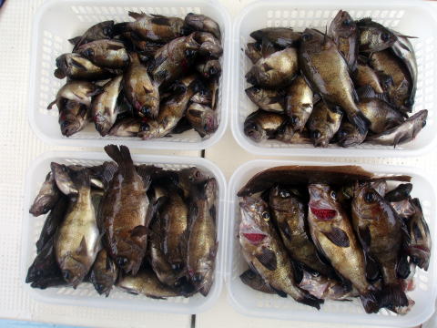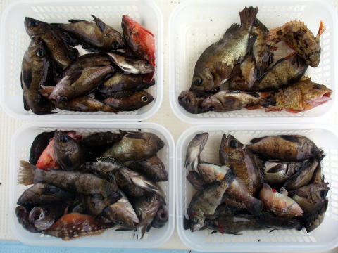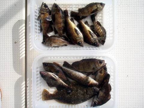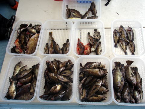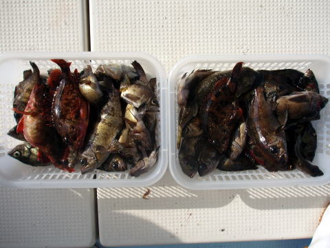 二日前に団体様{6名}のキャンセルが入り船長少し 落ち込んでましたが、今日は気合を入れて出船! 昨日のお客様に申し訳ないほど今日は釣れました! 今日から大潮!爆釣です! 沖あがりまで止まりません・・・ メバルの反応バリバリでした。 潮がとまっている間は 左の写真以外にミニミニサイズのメバル{30匹位}が 釣れましたが、来年 の為にリリースしてもらいました。 初挑戦の那須様も今日は大漁でニコニコ笑顔でした^^ 今日は爆釣だったので、船長今晩は美味しいビールが 飲めます^0^ 天気も最高、海もベタ凪今日は良かった です。 皆さん今日はお疲れ様でした。 メバル・・・29cm頭に 148匹。 ヒラメ・・・1匹。 アイナメ・・・3匹。 |