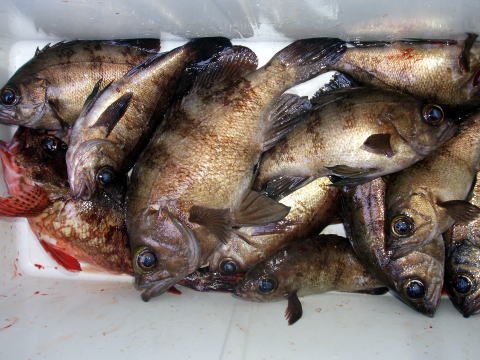 今日も平日出船でした。 今日も潮はゆったり流れてタナも非常に取りやすかった みたいですね〜 ポイント着後まずはメバルの反応探し です。 数箇所まわった所で良い反応見っけ^^ いきなり2連、5連です。 しかし長続きはせず群れは 散る始末・・・ それからは小さい反応に仕掛けを投入 して単発でポツリポツリ状態。 そして潮とまりで恒例の 沈黙タイム・・・ 潮が流れ出す時、どのポイントで開始 しようかと、そうとう悩んで思い切って今回はポイントを 大移動しました。 しかしこのポイントメバルが1匹も 食いません・・・ 粘りましたが1匹も食いません。 去年はこのポイント尺メバル入れ食いだったのに・・・ それから又、ポイント大移動〜 あ〜ここはメバル いるぞ〜 でも時合は終わりかけていました・・・ 一番良い時間帯に他に行ってたんで釣果はご覧の通り です・・・ 今日は船長のポイント設定ミスです。 ゴメンナサイ・・・ 今日は大漁気分を皆さんに味わって もらいたかったのですが・・・1人分で30匹位は釣らせて あげたいといつも思っているのですが思うようにいきませ せん。今日の竿頭は城野様でした。城野様の写真撮り 忘れてました。すいません。せっかく竿頭だったのに。 1日中鏡の様なベタ凪で天気もポカポカ陽気で良かった です。 お疲れ様でした。 メバル・・・29cm頭に54匹。 アラカブ・・・30cm頭に4匹。 アイナメ・・・40cm頭に2匹。 その他・・・ベラ、フグ。 |