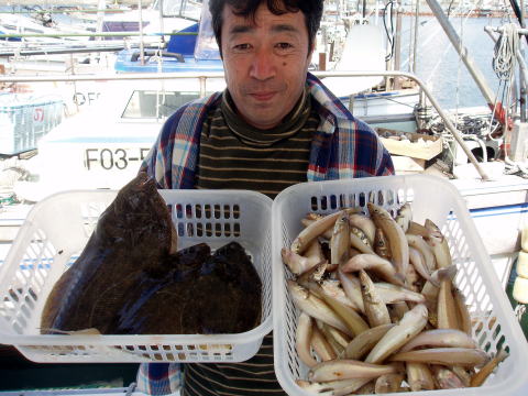今日のお客様は今村様1名です。 キス五目で出船予定 してたのですが今村様の要望でヒラメ釣りも少しやりたい との事で朝の2時間だけヒラメの泳がせ釣りしました。 なんと、2時間で1,3kg頭に3匹ヒラメを釣られました^^ 大型と思われる引きがありましたが、あと数mと言う所で ハリス切れ・・・ 残念です・・・ 今日はバラシも数回・・・ {船長〜ヒラメ3匹釣ったからキス釣りに行こう〜}との事で 次はキス釣りです。 キスも肘叩きサイズを筆頭に入れ 食い状態です。 一般にキスは小潮まわりですが、大潮 まわりの潮が早い時もキスのポイントあります! いつも思うのですが今村様は何の釣りされても上手いです。 これで十分との事で今日は早上がりしました。 魚料理もご自分でされるので、さばくの大変そう・・・ 今晩はヒラメの刺身、キスのテンプラと豪華な晩餐となり そうですね^^ お疲れ様でした。 {今村様1人分の釣果} ヒラメ・・・1,3kg頭に 3匹。 キス・・・27cm頭に 59匹。 |