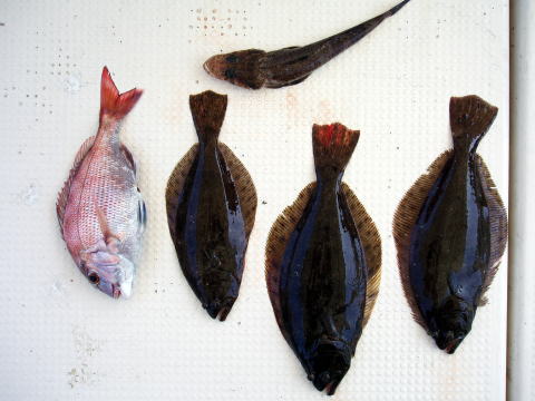 今日は尚人丸初乗船及び真鯛釣り初挑戦の若松様、 山口様と常連の西野様です。 今回は格安真鯛で 出船しました。 今日は若潮。昨日同様に潮は ゆったり流れてますので初心者の方にも楽に棚が 取れる潮です。今月に入って大潮、中潮、小潮、 長潮、若潮と全てボウズなしのパーフェークト! もちろん今日も全員安打!です。 今日は瀬際を 中心に狙ったのですが常連の西野様が良型の真鯛 を仕留められました^^ 良く引きましたね〜 タモに入れた途端、船上大賑わいでした。 若松様は真鯛の他にヒラメなども釣られました^^ 徐々にキロサイズも混じりはじめてこれからが楽しみ になってきましたね。 皆さん今日はお疲れ様でした。 真鯛・・・3,4kg 1匹。 ・・・キロオーバー 3匹。 ・・・900g 2匹。 ・・・600g以下30匹。 真鯛合計 36匹。 ヒラメ・・・1匹。 マゴチ・・・1匹。 コショウダイ・・・1匹。 その他・・・アラカブ、キス、シログチなど。 |