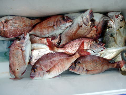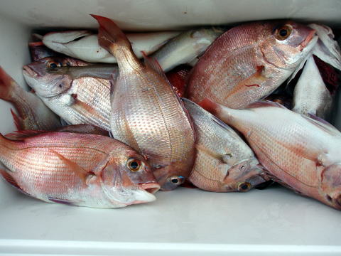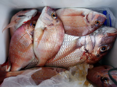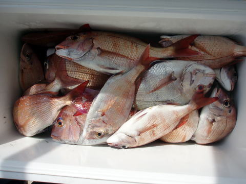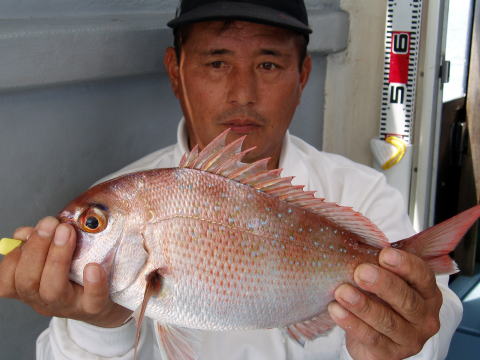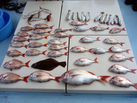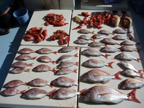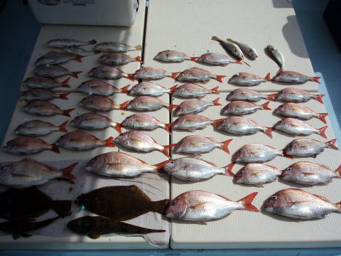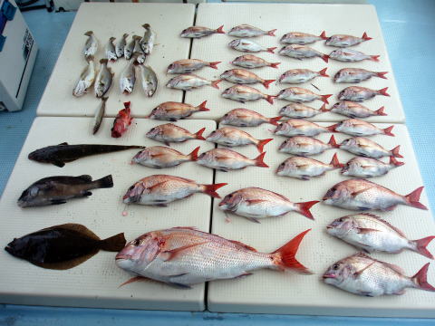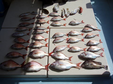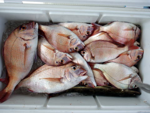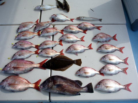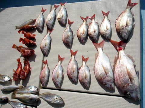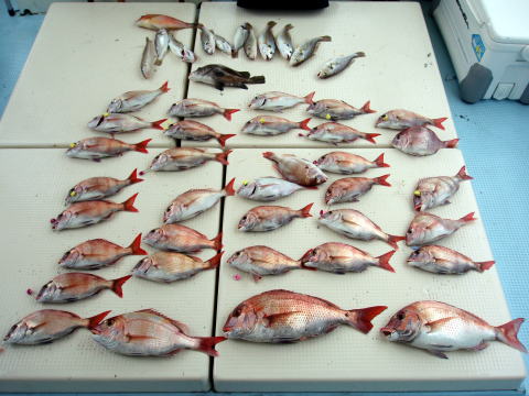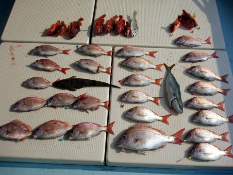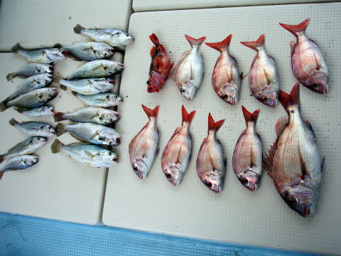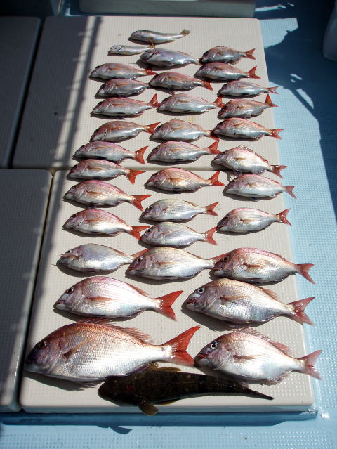 今ひとつ食いがパッとしませんでした。 ボウズの方はいませんでしたが釣果に 差が出た一日でしたね〜 ポイント着から沖あがりまで船長はキャビンの中で 見てましたがシャクリをされてないお客様もおられ ました。 もっと頑張ってシャクってもらえれば 釣果も期待出来ると思いますので次回は頑張って 下さいネ^^ 赤星様は今回テンヤ真鯛にチャレンジ で最初は棚取りで戸惑っておられましたが後半は 1匹釣られてコツをつかまれてからは調子が出て きましたね^^ あと一歩で二桁でした。 テンヤオモリに付けた・・・色の・・・は今回は正解 でしたね^^ 皆さん色々考えてこだわりの仕掛けを 考えておられますね〜 それも又釣りの楽しみですね。 前半は予報に反してウネリで釣りにくかったと思いま す。 でも後半は凪で助かりました。 今日乗船の皆さんお疲れ様でした。 真鯛・・・28匹。 その他・・・アラカブ、シログチ、タチウオ{クーラーの中}など。 |
