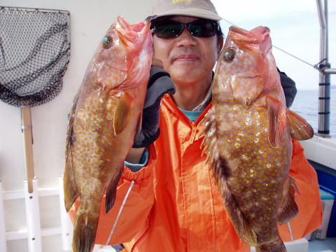 台風の影響もあって5日ぶりの出船です。 今日は女性の方と小学生の子供さんが良型真鯛 GETで船上賑わいました^^ 偶然にも両方とも54cmジャスト2,0kg! 良型コロダイも両方とも偶然にも46cm1,5kg! 美味しいアラカブも沢山釣れました〜 今日は天気も良く気持ちが良い1日で気持ちが 良かったです。 皆さん今日はお疲れ様でした。 真鯛・・・2,0kg{2匹} ・・・1,3kg{1匹} ・・・1.2kg{1匹} ・・・キロ以下{26匹} 真鯛合計・・・30匹。 コロダイ・・・46cm{1,5kg} 2匹。 アラカブ・・・47匹。 |