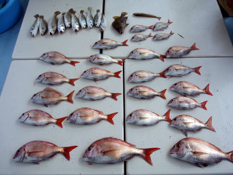 部品交換後の船降ろしが昨日になった為に今日からの 出船となりました。 今回のお客様は半分以上の方が 真鯛釣り初挑戦との事で、出船前に仕掛けの作り方 及び棚の取り方とミニ講習です。 さあ出発〜 出船時は凪でしたが、今日のポイントは朝から白波と ウネリです・・・ 釣りにくそう・・・ 早潮で皆さん今日は苦労されてたみたいです。 キャビンの中から見ていると、真鯛ばかり釣られる方 シログチばかり釣られる方と釣果に差が出た一日と なりました。 棚の取り方で差が出たと思います。 もう少し棚を上げて誘ったら真鯛も釣れると思います。 それと今回もスピニングリールの方は凄く棚取りで 苦労されてたみたいです。 お勧めは両軸リールが よろしいと思います。 棚取りが凄く楽になりますよ。 久々乗船のミスター0様は2キロクラスのコロダイを ヒットさせた後、良型の真鯛を3回も掛けたのですが 惜しくも3回ともバラシ・・・ 非常に残念がられて おられました。 今回はミスター0様ばかりアタリが集中 してたみたいです。 次回リベンジお待ちしております。 残念ながら今日は二桁釣られた方はおられませでした。 全体的に釣果も伸びませんでした。 揺れの中皆さん今日はお疲れ様でした。 真鯛・・・各自クーラーの中 |